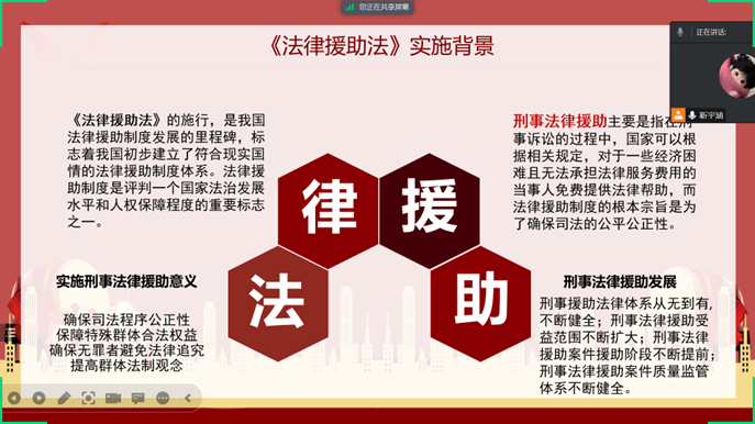 线上宣讲会由三部分组成,分别是《中华人民共和国法律援助法》实施背景、刑事法律援助制度的理论探讨、团队关于刑事法律援助制度的实地调研。