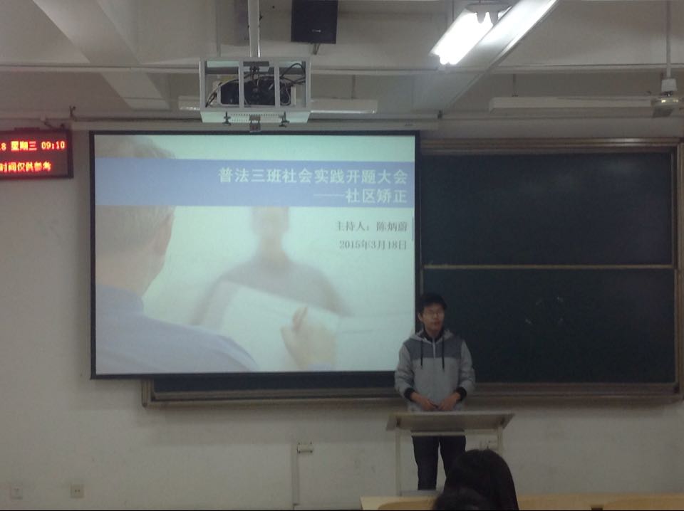 会议由法学三班班长陈炳蔚主持。首先,陈炳蔚介绍了社会实践活动主题的征集情况和结果,经同学们投票决定将主题定为社区矫正。随后,他对社区矫正进行了初步讲解,分析了社区矫正目前在济南的现状以及社会实践的可行性。最后,同学们分小组展开讨论,商议出志愿服务、普法宣传、问卷调查、辩论等多种既符合法科学生特点又便于大学生实施的活动形式。