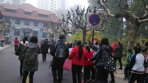 上午九点,甸柳小学的同学们在家长的陪同下来到山东大学洪家楼校区,并在志愿者的引导下,来到法新楼前合影。在路上,志愿者们热情地为各位同学及家长介绍山大文化。