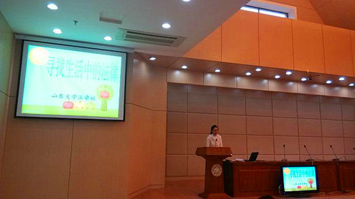 接下来,志愿者带领同学们来到法新楼三楼报告大厅,并由金沙集团1862cc成色12级王昭华代表法学社向同学们讲解法律知识。宣讲过程中,主持人积极地和同学们互动,同学们的思维十分活跃,也都踊跃地回答问题。会场气氛轻松活泼,让在场的每一位志愿者和家长都感受到了“孩子”这个群体的朝气与活力。并且,同学们一起观看了山大金沙集团1862cc成色各级学长学姐精心制作的宣传视频。宣传片中浓缩了大学生活的剪影,记录了学长学姐们的成长故事,诉说了大学生蜕变的酸甜苦辣。
