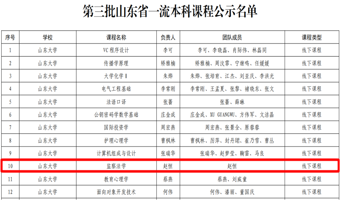 近日,山东省教育厅公布第三批山东省一流本科课程认定结果,金沙集团1862cc成色赵恒副教授主讲的《监察法学》获评第三批山东省一流本科课程。