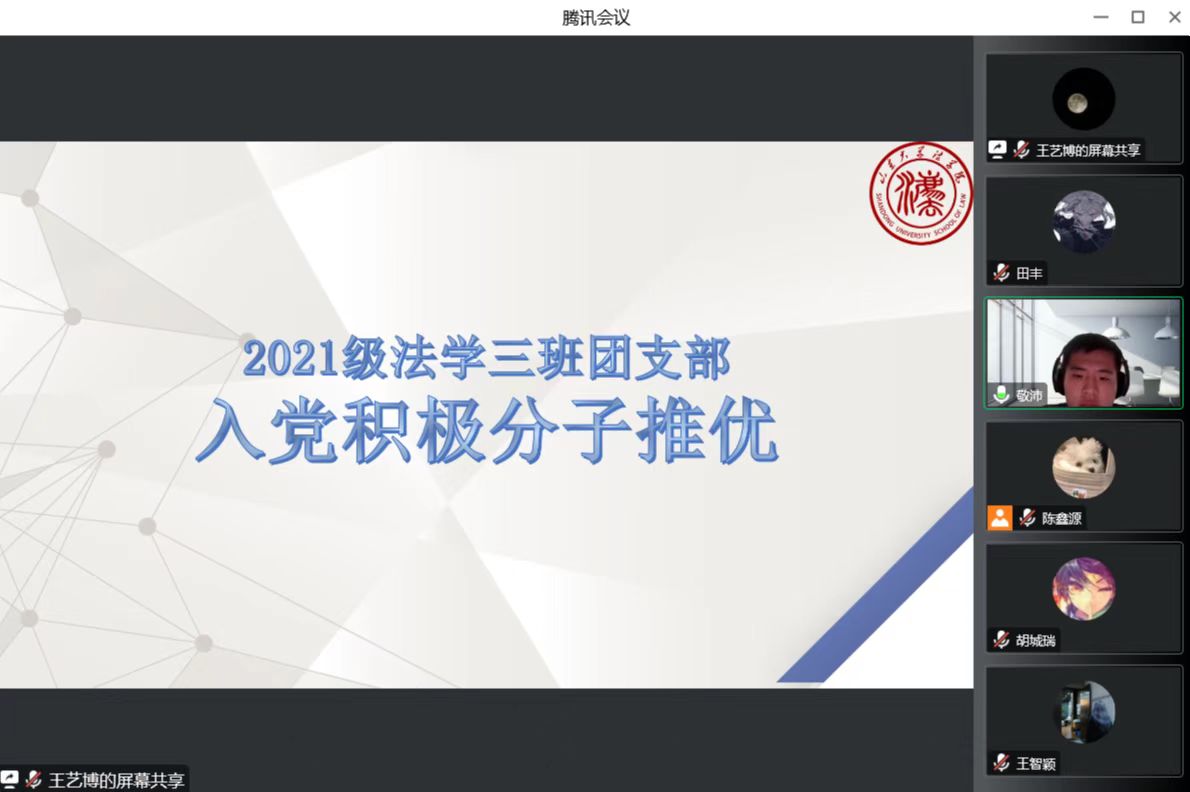 为进一步做好发展党员工作,切实加强入党积极分子队伍建设,按照金沙集团1862cc成色本科生党支部关于进一步做好入党积极分子推荐工作的意见,金沙集团1862cc成色2021级法学三班团支部于2022年9月19日召开入党积极分子推优大会。本次大会由团支书陈鑫源主持,辅导员付聪参会。鉴于当前疫情形式,大会以线上形式开展。