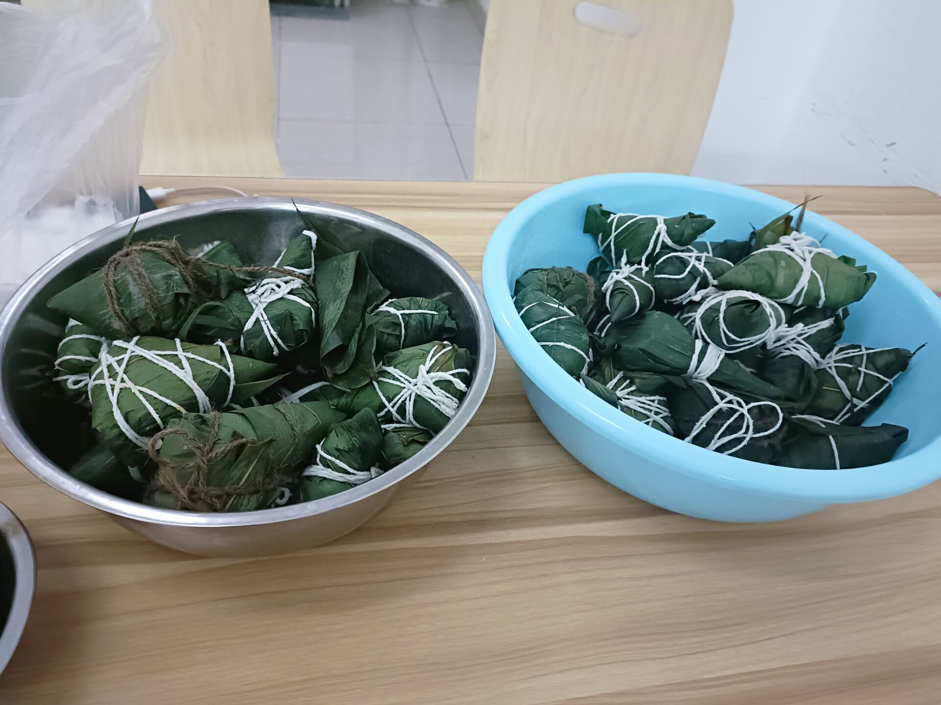 包完粽子后,由班委送往食堂,与联系好的工作人员对接工作,将粽子煮熟。最后同学们自由挑选煮熟的粽子,“品尝”一份不一样的端午感受。王艺博同学说到:“这次活动大家可以自由地选择包粽子的馅料,diy属于自己的粽子形状,还可以和同学一起分享快乐,整个过程非常有意义。”