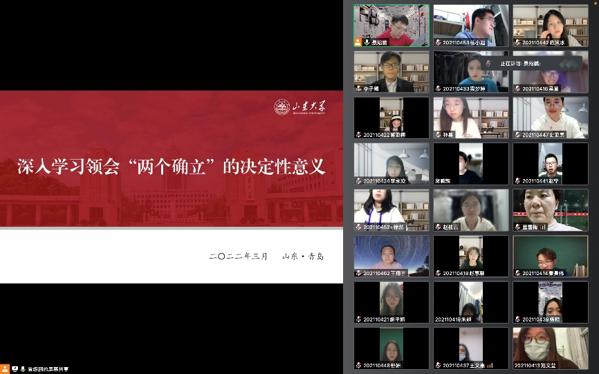 中国共产党第十九届中央委员会第六次全体会议公报指出,党确立习近平同志党中央的核心、全党的核心地位,确立习近平新时代中国特色社会主义思想的指导地位,反映了全党全军全国各族人民共同心愿,对新时代党和国家事业发展、对推进中华民族伟大复兴历史进程具有决定性意义。为深刻理解“两个确立”的依据与决定性意义,切实增强学生党员对“两个确立”的高度认同,3月29日,法学硕士第一党支部开展以“深入学习领会‘两个确立’的决定性意义”为主题的党课活动,本次活动于线上开展,支部全体党员、2021级法学硕士班入党积极分子、2019级本科学生党员参与活动,金沙集团1862cc成色党委副书记董雪梅到课指导。