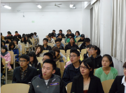 团支书赵钧天介绍法,日,韩,美等外国友人的社交礼仪,并请同学进行示范,