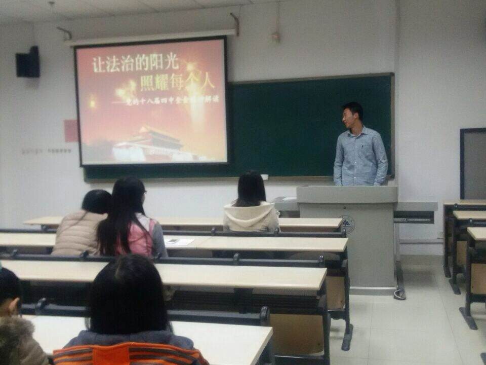 晚八点三十分主题团会准时开始。首先,主持人介绍了党的十八届四中全会的背景和概况。中国共产党十八届四中全会首次专题讨论依法治国问题。要实现这个目标,就要在中国共产党领导下,贯彻中国特色社会主义法治理论,形成完备的法律规范体系、高效的法治实施体系,坚持依法治国、依法执政、依法行政。这对于推进国家治理体系和治理能力现代化具有重大而深远的意义。接着,张文芳同学以改革开放为分界线介绍了中国依法治国的历史进程,让同学们清楚明晰地了解到中国特色社会主义法治理论的形成经过。最后,同学们在王选和同学的带领下研究了党的十八届四中全会的亮点,着重探讨了依宪治国、法治与人治的区别、做决策要终身担责等问题。在同学们的掌声中,班级团会圆满结束。
