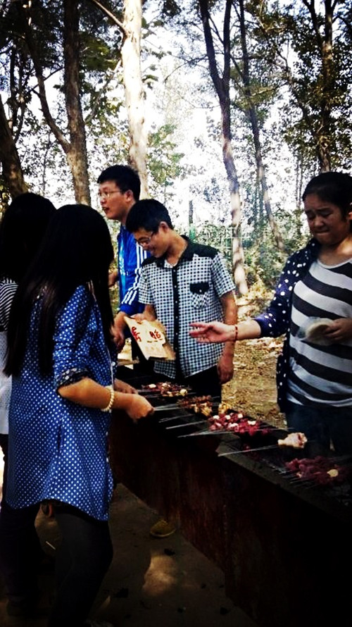 正是因为每个人心中对野外烧烤的满心期待,不到半个小时的路程却好似被拖延了一般,大家都不时的望向窗外,希望黄河的蜿蜒与壮阔能尽快的进入眼中,而在脑海之中,烤肉早已嗞嗞作响,香气也已扑鼻而来。下车之后,每个人都不约而同的做好了分工,自觉并有秩序的拿起所有食材一起走进黄河森林公园的烧烤区。搬烤架、擦桌子、生炭火都在有条不紊的进行着,烧烤的气氛也在一点点的浓重起来。前期准备工作都已顺利完成之后,同学们都迫不及待的打开等待消灭的牛肉和各类蔬菜,同样的,大家还是不约而同的进行分工,都在忙着手中的事儿,但却没有乱了秩序。很快,一切准备就绪,只待烤炉中香飘四溢了。