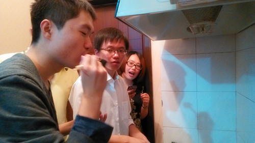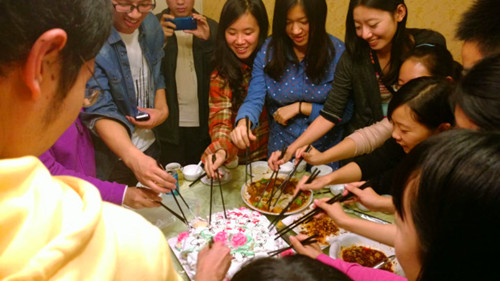 来到我们租好的房间里,比想象中的要小,但看到大家在笑在闹,觉得很是温暖。在做菜的地方,小雪在切菜,亚琼在刷锅,会帅他们在择菜、洗菜,思然和博雅他们在为将要做的菜做各种准备,床上坐着许多人在看电视,沙发上一些人在吃零食,房间里欢声笑语不断,很是热闹。这一次的厨师主要是思然和博雅,鉴于他们的优秀表现,大家不禁向他们说道:要嫁就嫁李思然,要娶就娶陈博雅。厨房那边在紧赶慢赶地做着菜,客厅这边的人早已经不起香味的诱惑,开始对食物各种上下其手,于是美味的晚餐就这样华丽丽地开幕了。