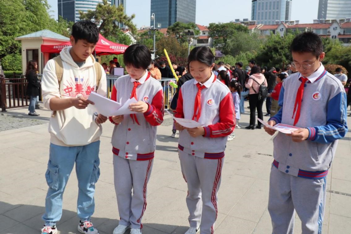 在研学小组到达解放阁后不久,遇见了同是前往解放阁进行参观学习的由济南当地小学生自发组成的红色学习小组,在双方进行短暂的交流之后,各位“小同学”热情高涨,主动向研学小组请教有关解放战争、济南战役以及解放阁的有关知识,小组成员也积极响应,向各位“小同学”和其他市民、游客分发了事先准备的学党史宣传单页,并就大家提出的问题进行耐心解答。