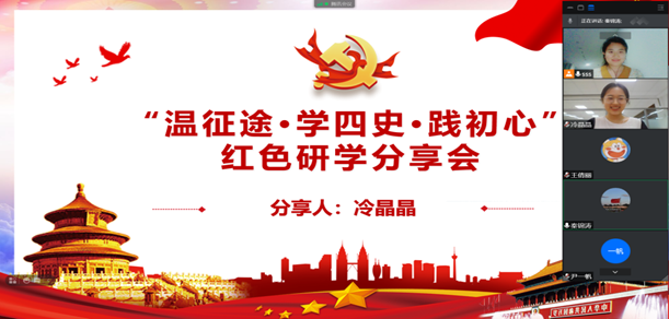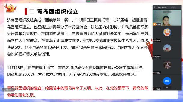 第二点,针对线下实地寻访等内容开展线上分享会,使大家能够充分地分享自己的学习心得,互相交流,互相学习,如团队成员冷晶晶表示:通过此次分享会,历史仿佛回到了我们身边,我对青岛的党史有了更深的体悟。在异常艰苦的革命战争年代里,革命先辈们放弃优越的生活条件,抛头颅洒热血,坚定崇高的共产主义理想信念,无论受到何种不公待遇和挫折,仍然坚持为人民的解放事业奋斗终身。无数优秀共产党员以他们的实际行动,做出了光辉的榜样。有人说:人不是活在物质世界里,而是活在精神世界里,活在理想与信念之中。对于人的生命而言,要存活,只要一碗饭,一杯水就可以了;但是要想活得精彩,就要有精神,就要有远大的理想和坚定的信念。