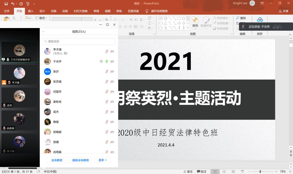 法学一班全体同学在班长的号召下开展线上祭英烈活动,在网页上为英雄们点亮一支蜡烛,献上一束花圈,铭记先辈们筚路蓝缕的开荒跋涉历史。法学二班全班同学在网上向烈士献花致敬,部分同学前往青岛革命烈士纪念馆向烈士低头默哀,通过线上线下相结合的方式祭奠英烈。法学三班开展“网上祭英烈”活动,同学们通过中华英烈网的祭扫窗口进行网上祭扫、敬献花篮,缅怀革命烈士,体悟崇高精神。中日经贸法律特色班通过腾讯会议APP开展了“清明祭英烈”主题班会活动,班长向同学们详细介绍了多位英雄先烈的不朽事迹,各位同学积极讲述英雄故事并在网上为英烈献花致敬。