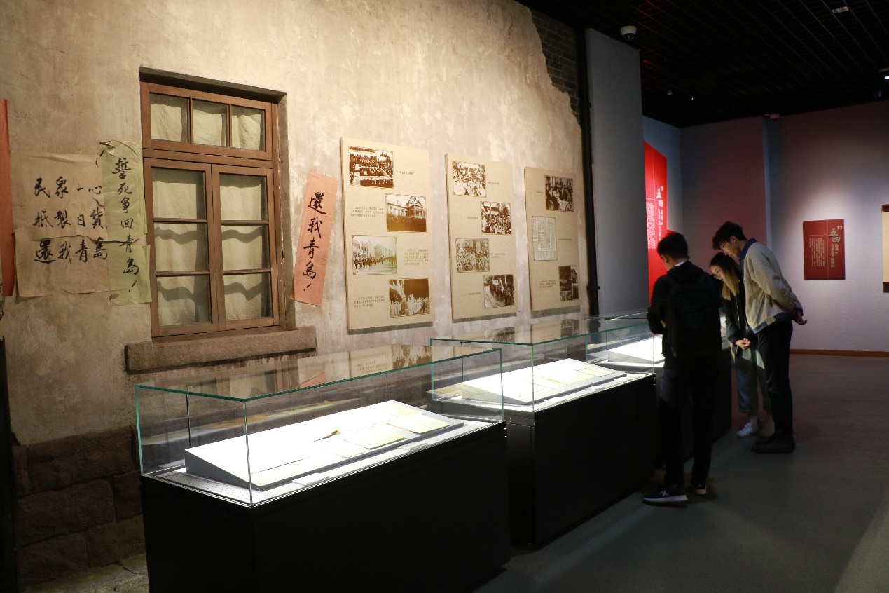 团员代表胸带团徽,首先来到青岛市博物馆,在引导员的带领下,主要参观了青岛市博物馆的近代展厅中有关五四运动与青岛主权回归的展览。馆厅通过展示五四运动时期的文物,还原了学生游行的场景,“外争国权,内惩国贼”“誓死力争,还我青岛”等标语让我们感同身受。团员们认真参观学习后,积极提出自己的感想与思考,并且在五四运动背景板下与团旗合影。