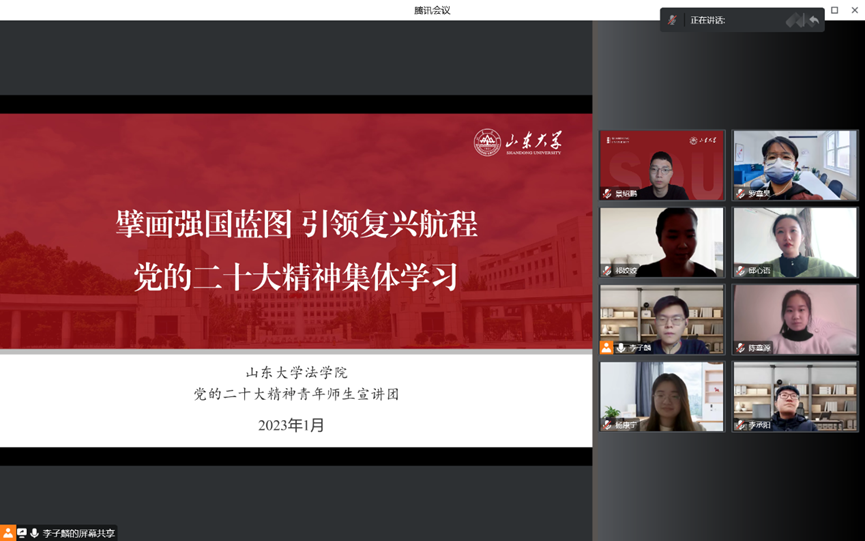 宣讲工作于1月上旬全面启动,团队成员分别在山东、河南、重庆等地,走进社区、学校、企业,以新时代十年的伟大变革及其里程碑意义、马克思主义中国化时代化新境界的开辟、中国式现代化的内涵特征和本质要求、坚持全面依法治国与推进法治中国建设等专题为重点,发挥法科专业优势,对党的二十大报告进行了详细分析及解读,以期弘扬社会主义法治精神,引导宣讲受众做社会主义法治的忠实崇尚者、自觉遵守者、坚定捍卫者。宣讲内容既饱含理论高度,聚焦“大导向”,又结合具体案例,找准“小切口”,形式多样,深入浅出,生动活泼。截至2月上旬,团队累计开展宣讲活动七场,共有近三百名各地民众听取,引起了热烈反响。