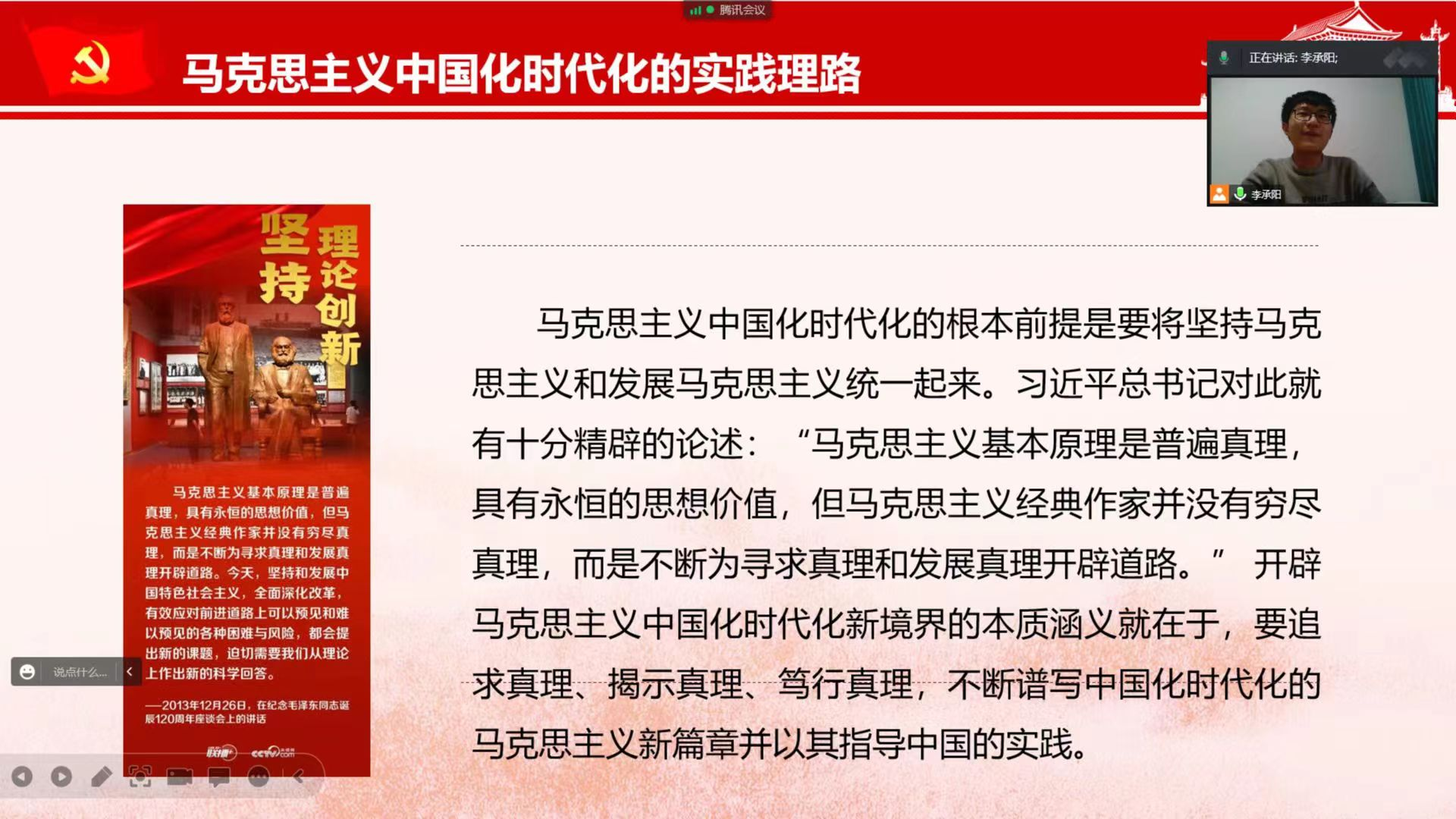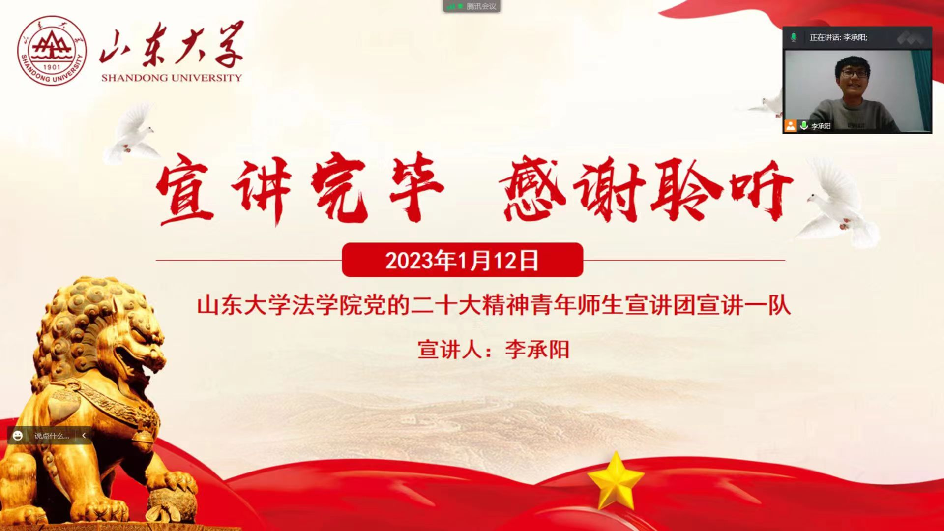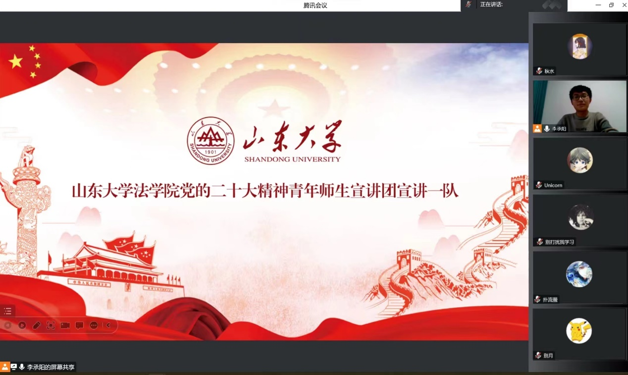 踔厉奋进新征程,凝心聚力谱华章。党的二十大胜利召开后,金沙集团1862cc成色青年师生把学习好、宣传好、贯彻好党的二十大精神作为当前和今后一个时期的首要政治任务。为进一步把思想和行动统一到党的二十大精神上来,把智慧和力量凝聚到实现党的二十大部署的各项任务上来,金沙集团1862cc成色立说立行,成立了党的二十大精神青年师生宣讲团。2023年1月12日,宣讲团宣讲一队队员李承阳同学以腾讯会议的形式,对滕州市第一中学部分高中生进行了党的二十大精神的线上宣讲。