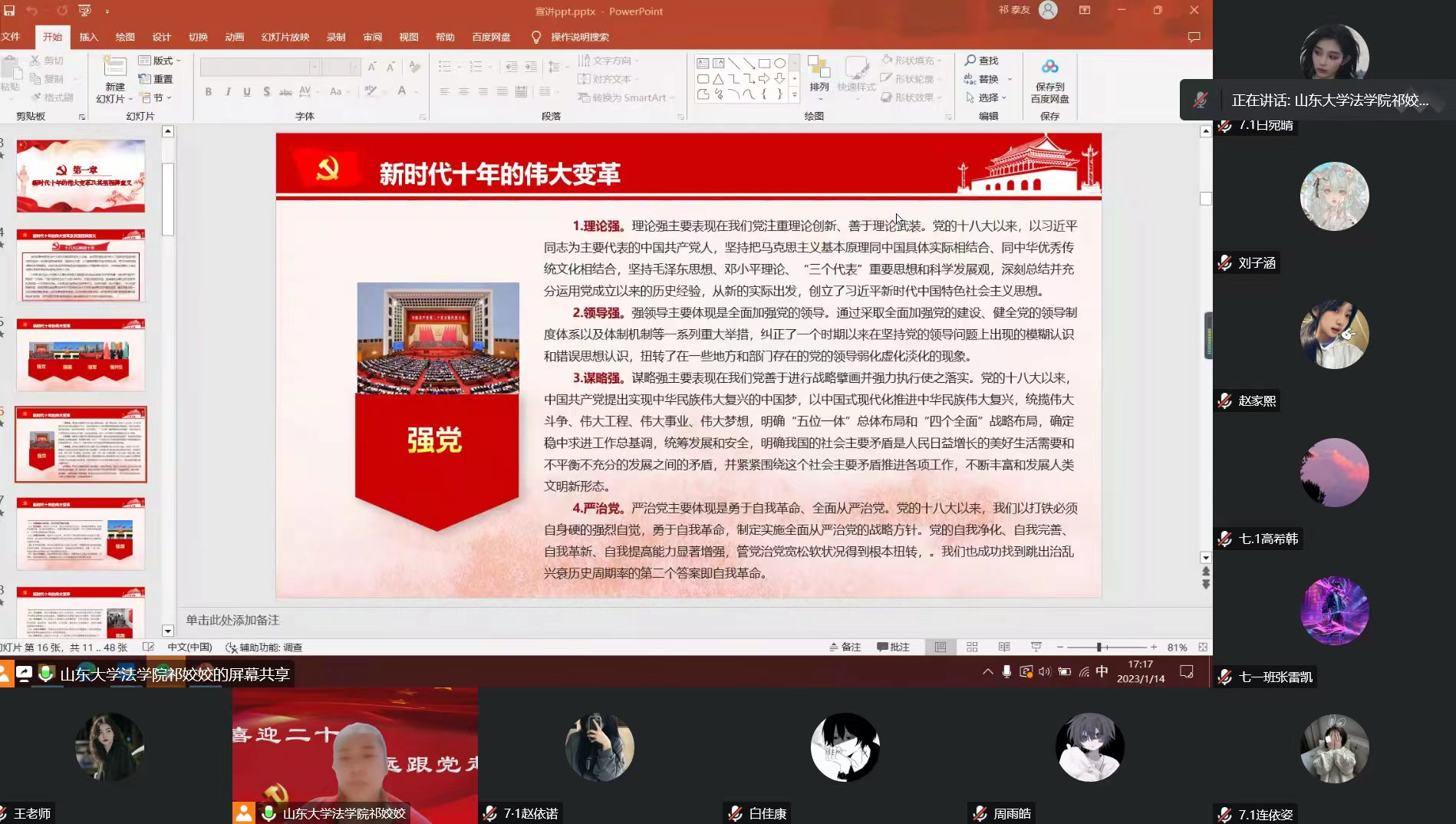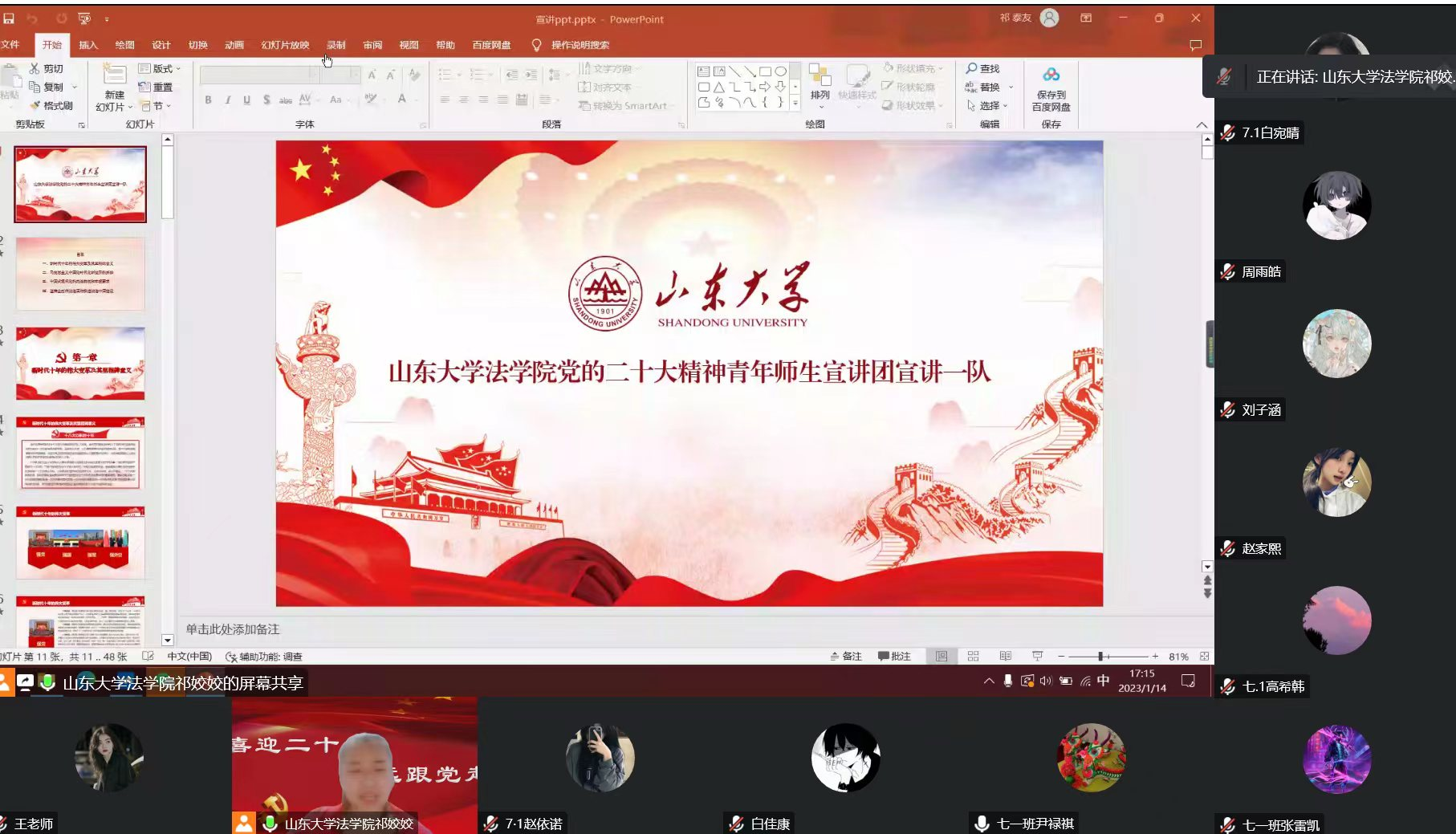 2023年1月14日,金沙集团1862cc成色党的二十大精神青年师生宣讲团宣讲一队面向河南省长垣市赵堤镇华龙学校七年级一班30余名同学开展了一场线上专题宣讲。此次宣讲由该班班主任韩老师主持,金沙集团1862cc成色2022级研究生祁姣姣进行了宣讲。